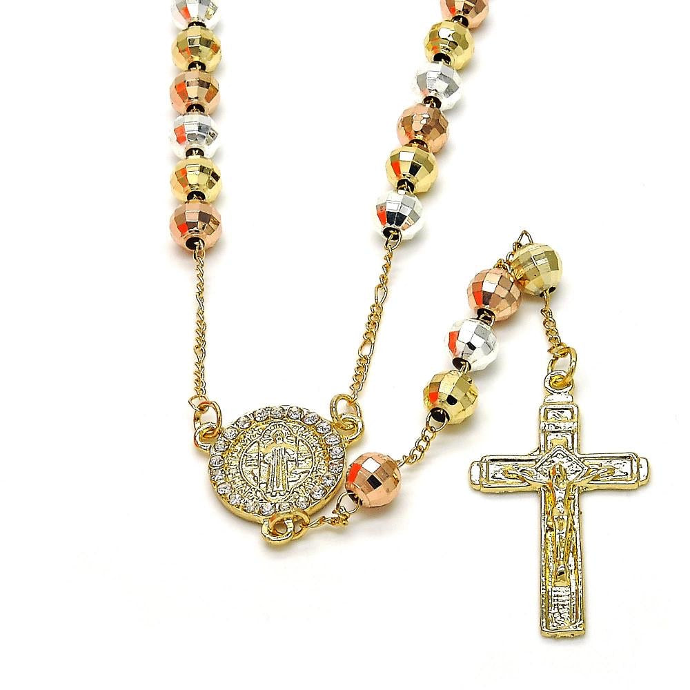 Rosary necklace tricolor Saint Benedict medal with cubic zirconia 24”