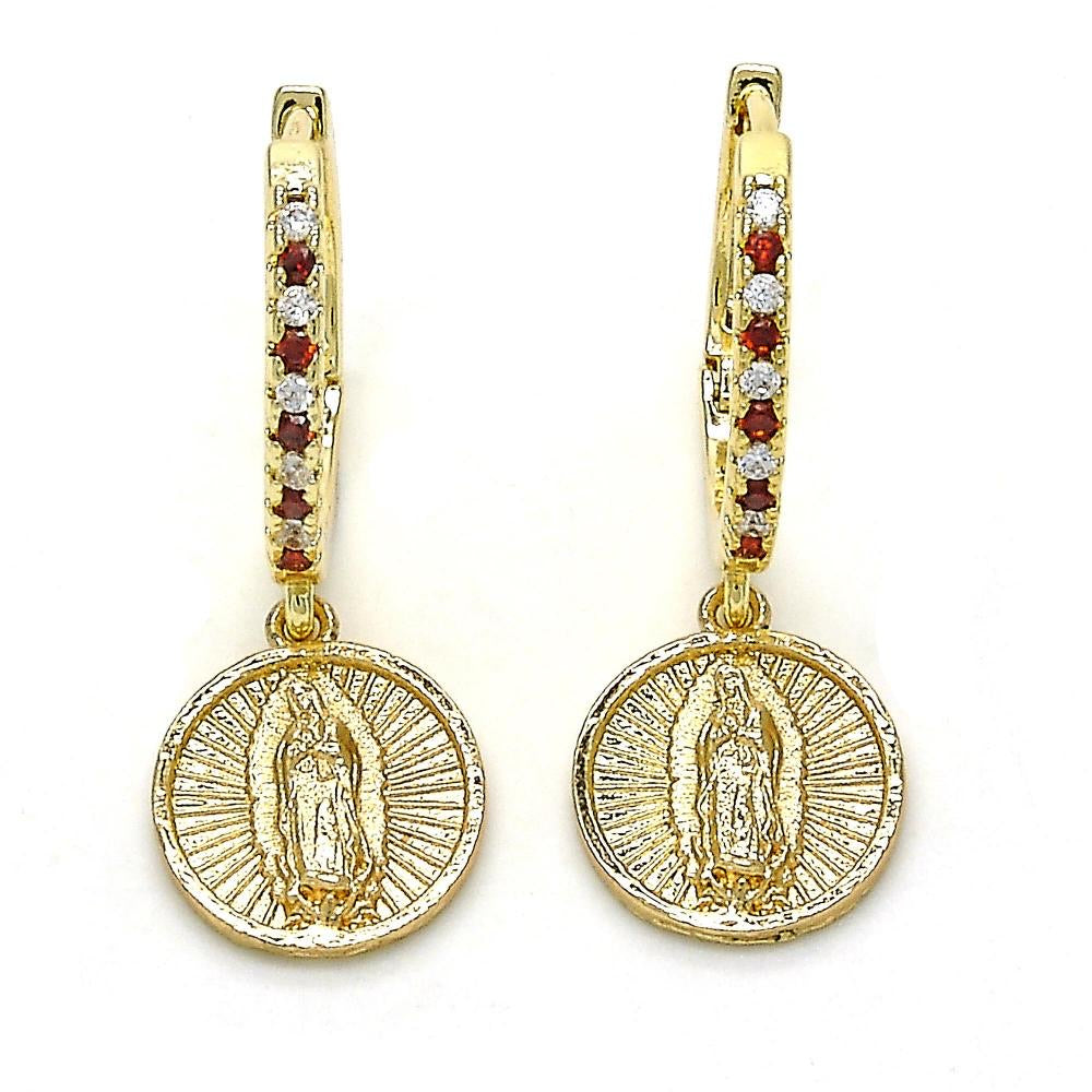 Hoop earrings with red and white cubic zirconia and Guadalupe medal