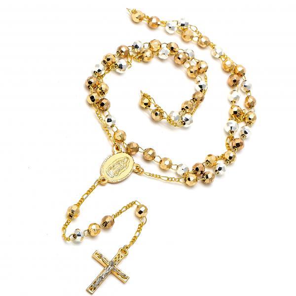 18 K Gold Over Sterling Silver tricolor Rosary Necklace with Guadalupe Medal 24"
