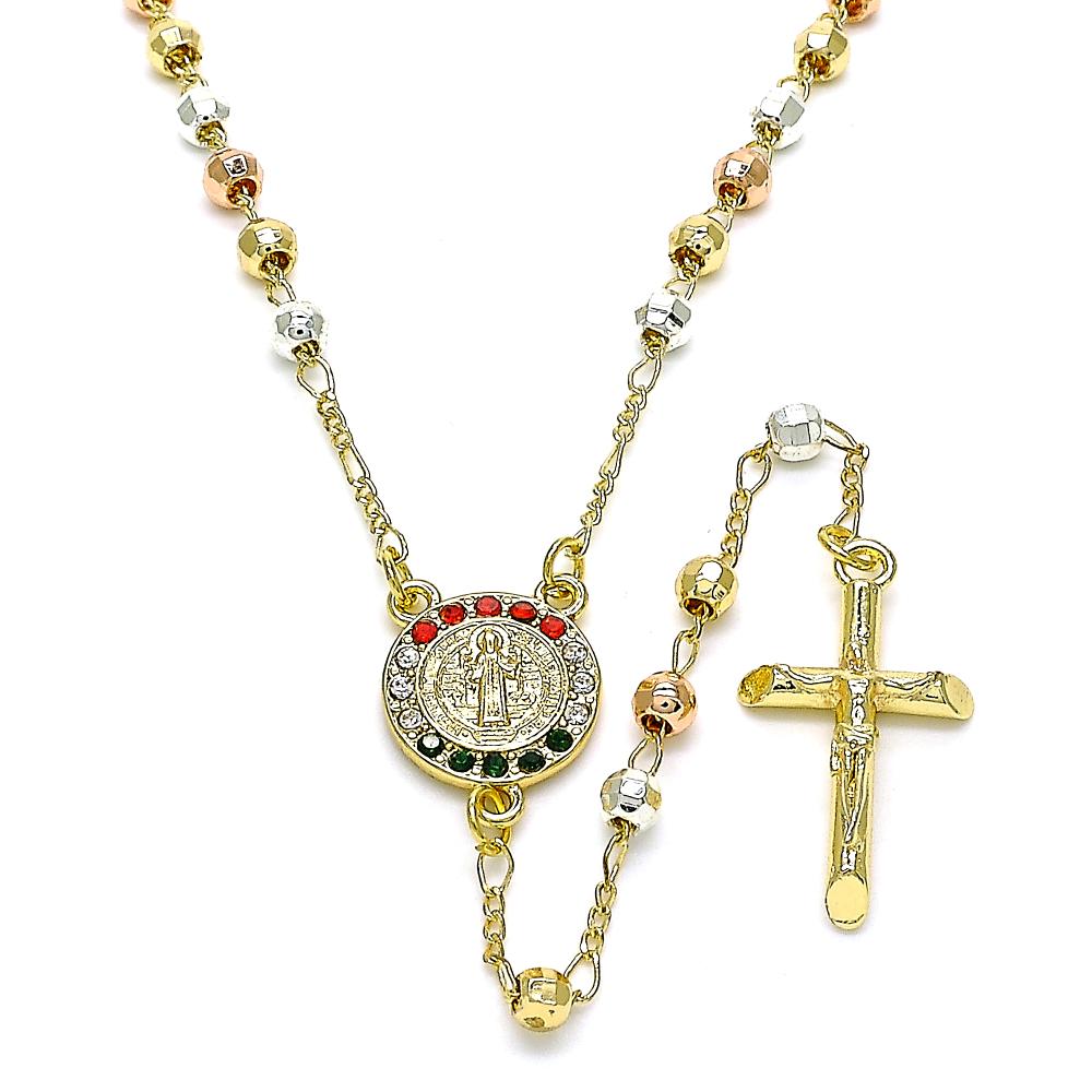 22” tri tone Rosary necklace with color cubic zirconia Saint Benedict medal
